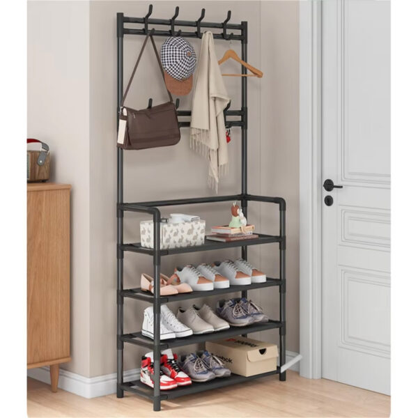 رف أنيق وعصري لتنظيم الأحذية، المعاطف، المظلات وغيرها من الأغراض في مدخل المنزل.