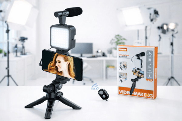 نظام إضاءة LED، ميكروفون احترافي، وحامل هاتف قابل للتعديل — إعداد متكامل لتصوير فيديو عالي الجودة في أي مكان.