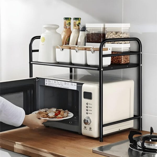 حوّل مطبخك إلى مساحة مرتبة وعملية مع منظم وحامل الميكروويف بطابقين، المصمم خصيصًا لاستغلال المساحة العمودية وتوفير مكان إضافي للأجهزة وأدوات المطبخ.